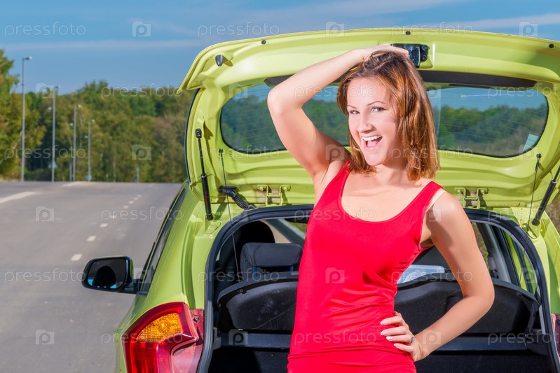 Портрет красивой молодой женщины возле автомобиля
