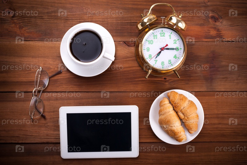 Кофе, будильник, очки, цифровой планшет и круассаны