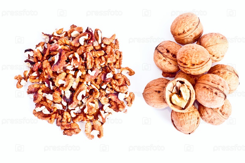 На столе лежит множество целых и крупнометражных орехов, изолированных на белом