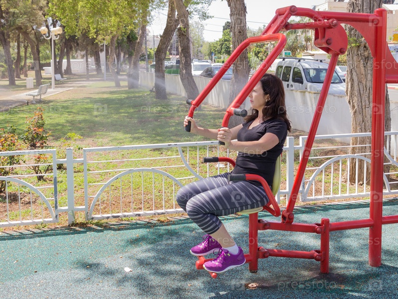Женщина занимается на тренажере на свежем воздухе
