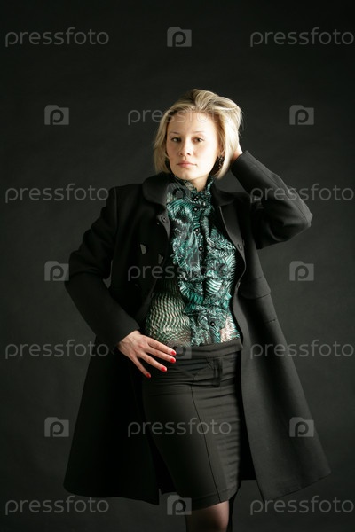 Портрет красивой, молодой девушки-блондинки в зеленой прозрачной блузке и черном пальто