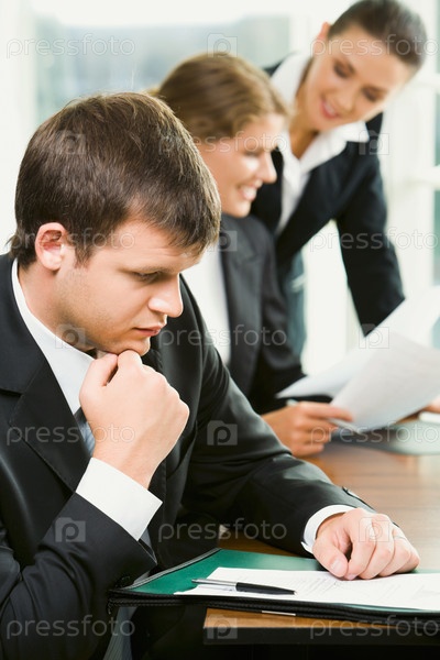 Портрет молодого бизнесмена, читающего интересное соглашение, лежащий на столе