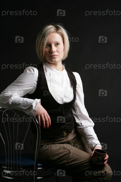 Портрет красивой, молодой девушки-блондинки в зеленой прозрачной блузке и черном пальто