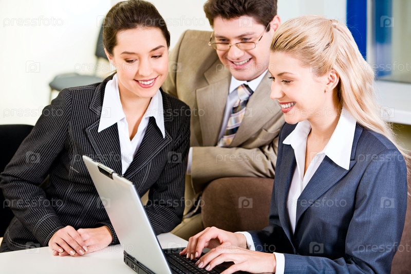 Портрет трех молодых специалистов, смотрящих на монитор ноутбука