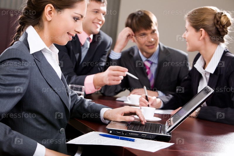 Очаровательная девушка печатает на ноутбуке на фоне деловых людей в офисе