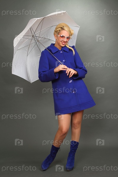 Красивая блондинка в темно-синем пальто с белым зонтиком в руке