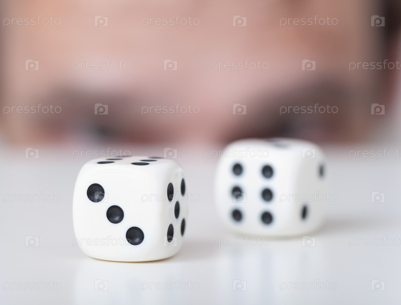 Два белых игровых куба (кости) на фоне глаз