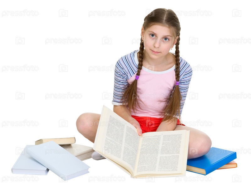 Школьница сидит с кучей книг на белом фоне