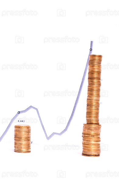 Растущие кучи монет с графиком. белый фон