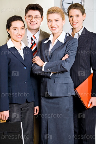 Портрет четырех успешных профессионалов, стоящих в офисе