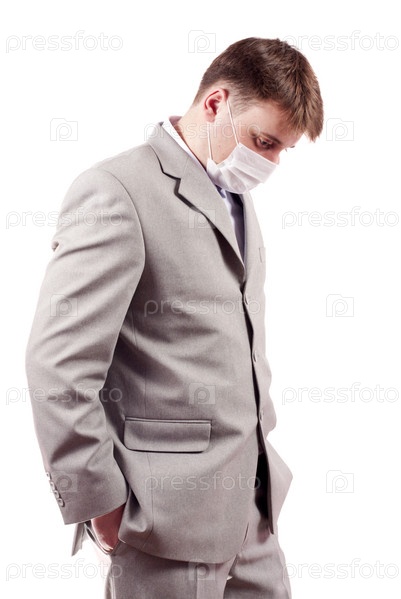 Мужчина в медицинской маске на белом фоне