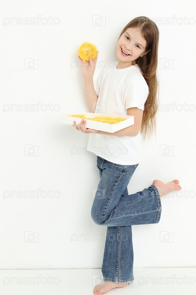Счастливая девочка с макаронами