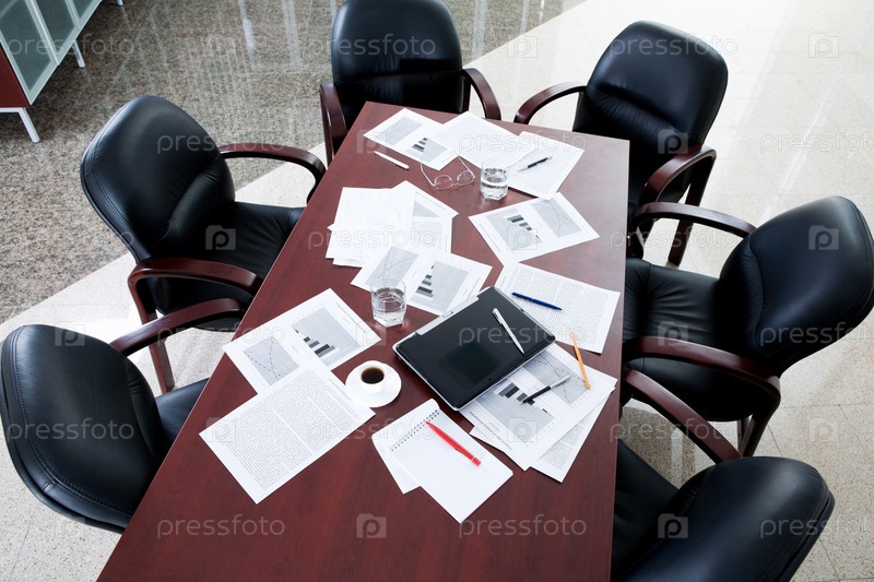 Темные кресла стоят вокруг стола с документами и ноутбуком в офисе