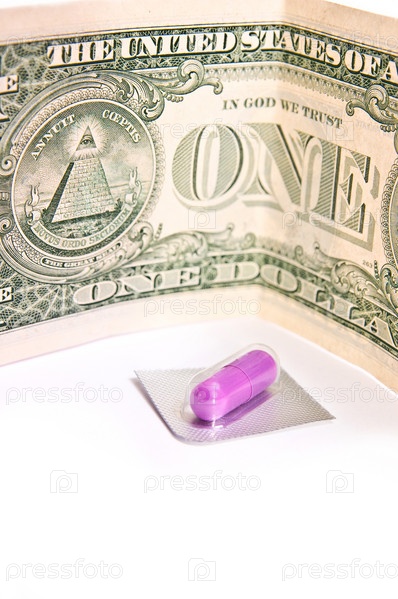 Одна красная таблетка с одним долларом, изолированным на белом