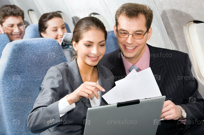 Портрет деловых людей, обсуждающих важный рабочий вопрос в самолете