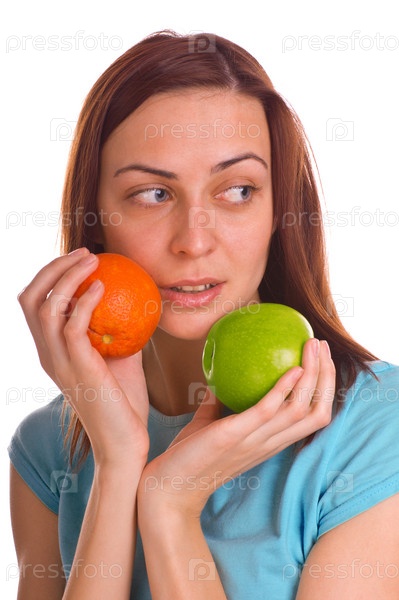 Молодая женщина с фруктами на белом фоне