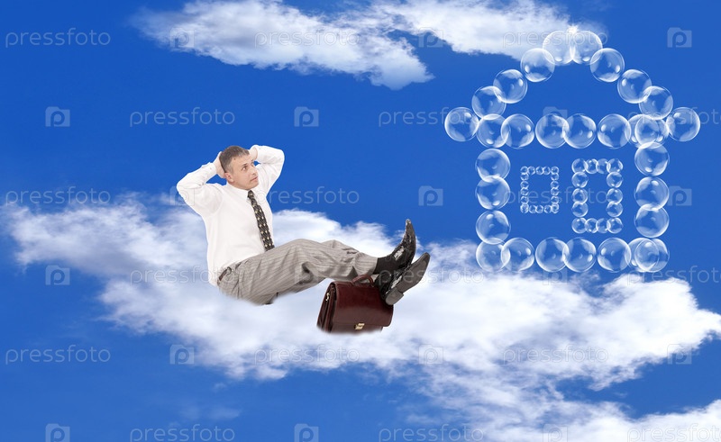 Дом из мыльных пузырей и бизнесмен на фоне неба