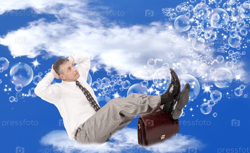 Отдыхающий бизнесмен и мыльные пузыри на фоне неба