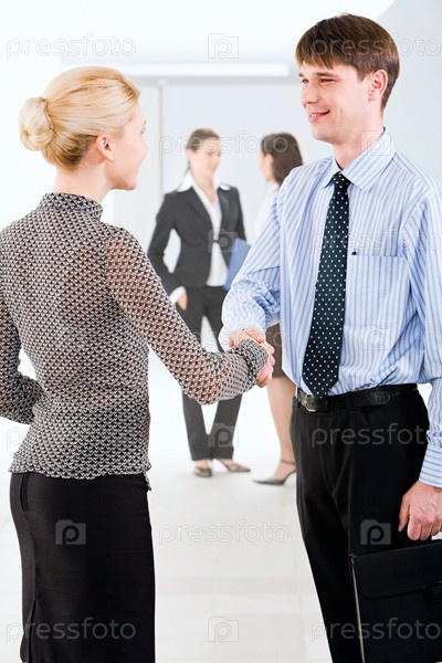 Рукопожатие бизнесменов на фоне их представителей