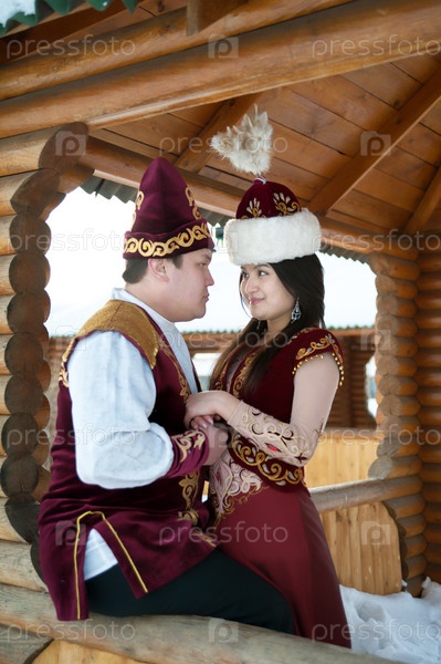 Мужчина и женщина в национальных костюмах в деревянном доме