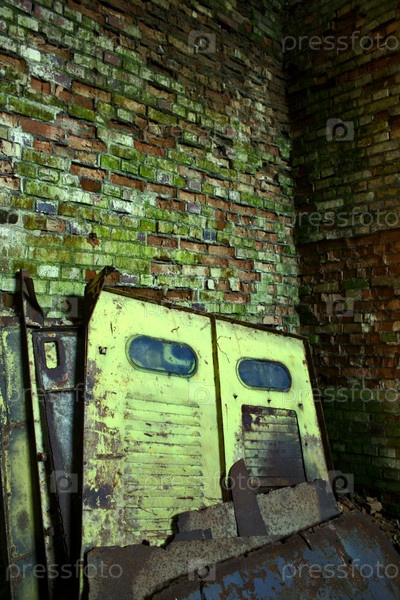 Старая железная дверь у кирпичной стены