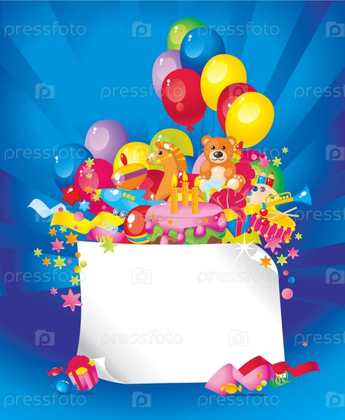 Детский день рождения: игрушки, торт, воздушные шары, подарочные коробки и рамка для вашего поздравления