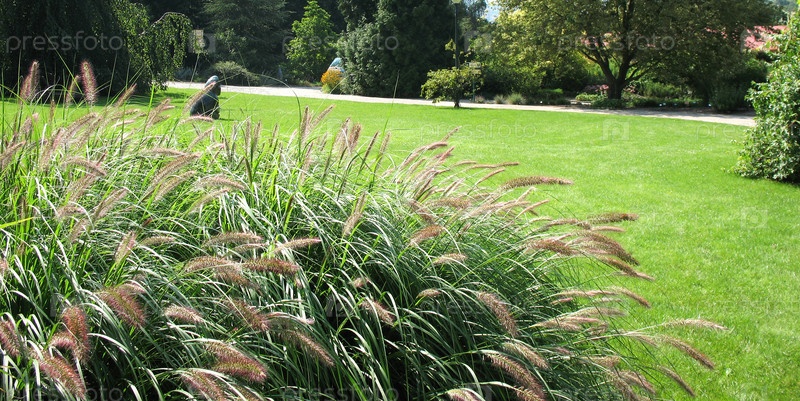 Куст мискантуса (Miscanthus) семейства мятлистых на фоне газона.Ботанический сад в Праге