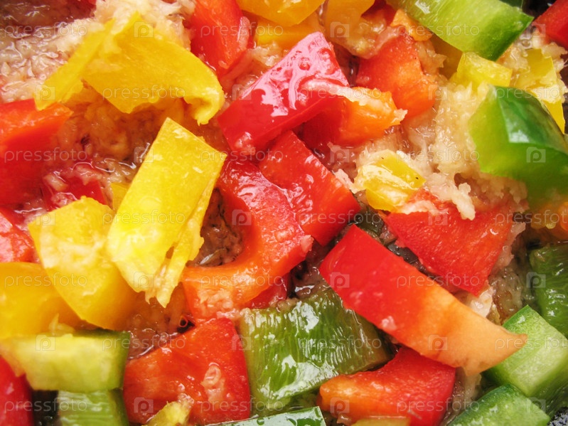 Желтый, красный и зеленый перец болгарский в сковороде. Нарезка. Кубики