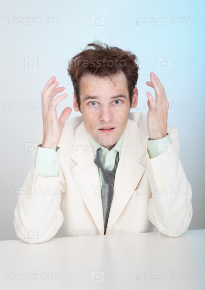 Молодой печальный бизнесмен сидит за светлым столом