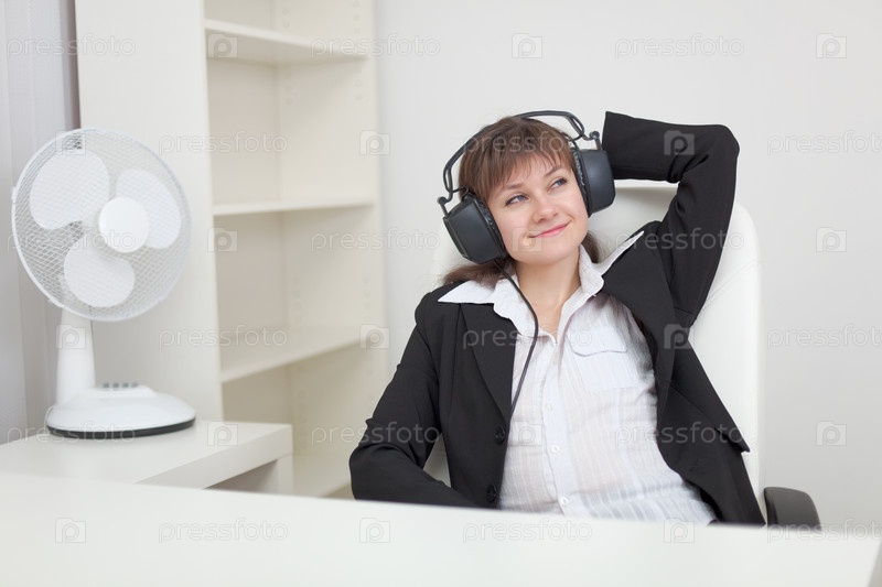 Молодая женщина сидит в кресле и слушает музыку на больших наушниках