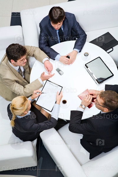 Бизнесмены сидят на белых диванах во время обсуждения нового проекта