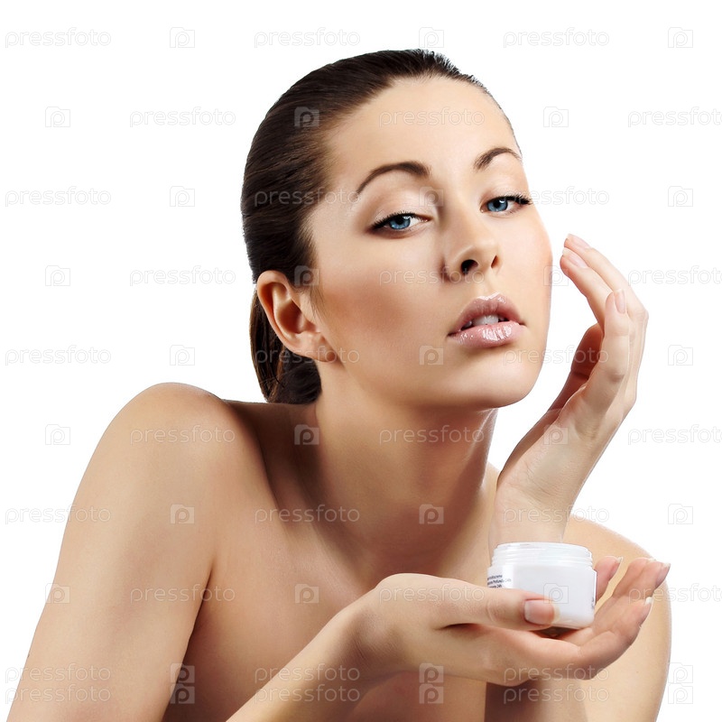 Красивая молодая женщина наносит крем на лицо
