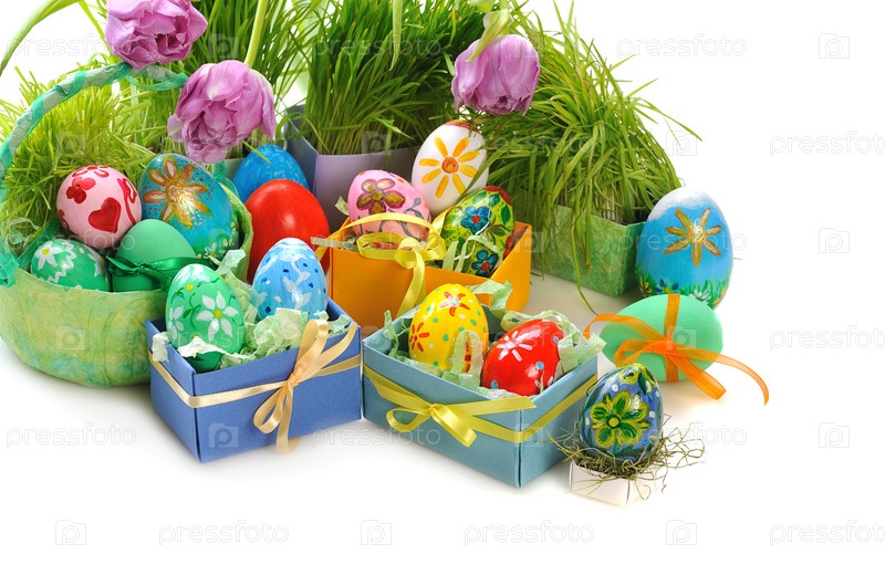 Окрашенные пасхальные яйца и тюльпаны на белом фоне