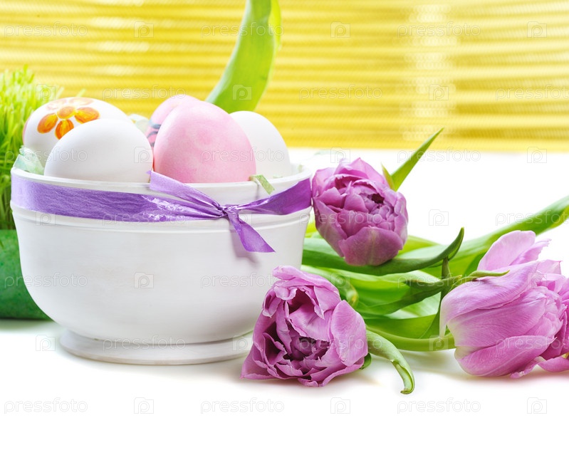 Пасхальные яйца с тюльпанами на белом фоне