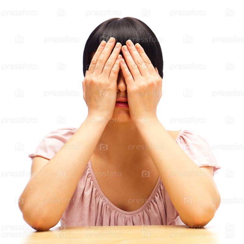 Молодая женщина сидит за столов, закрыв руками глаза