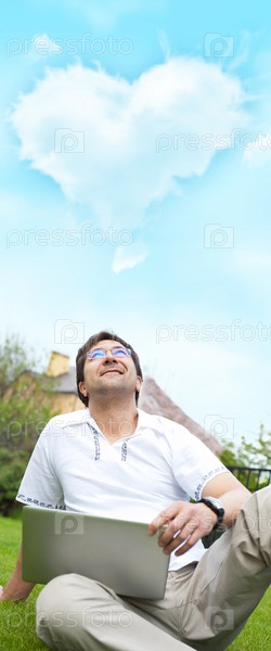 Улыбающийся мужчина с ноутбуком на зеленой лужайке