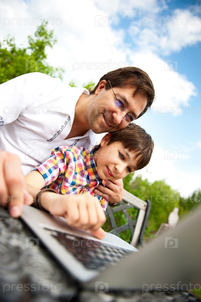 Папа с сыном с ноутбуком в саду