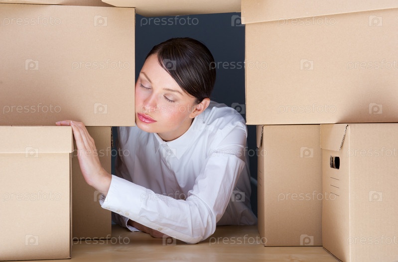 Портрет молодой женщины среди коробок