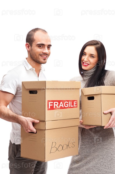 Молодая женщина и мужчина с коробками