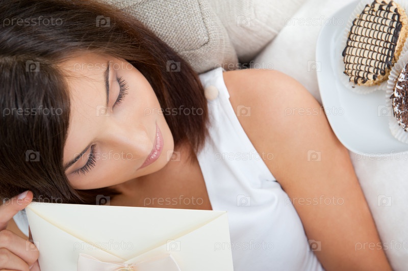Молодая красивая женщина с открыткой на диване