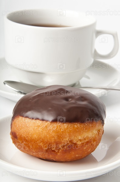 Пончик с шоколадом и чашка чая на белом фоне