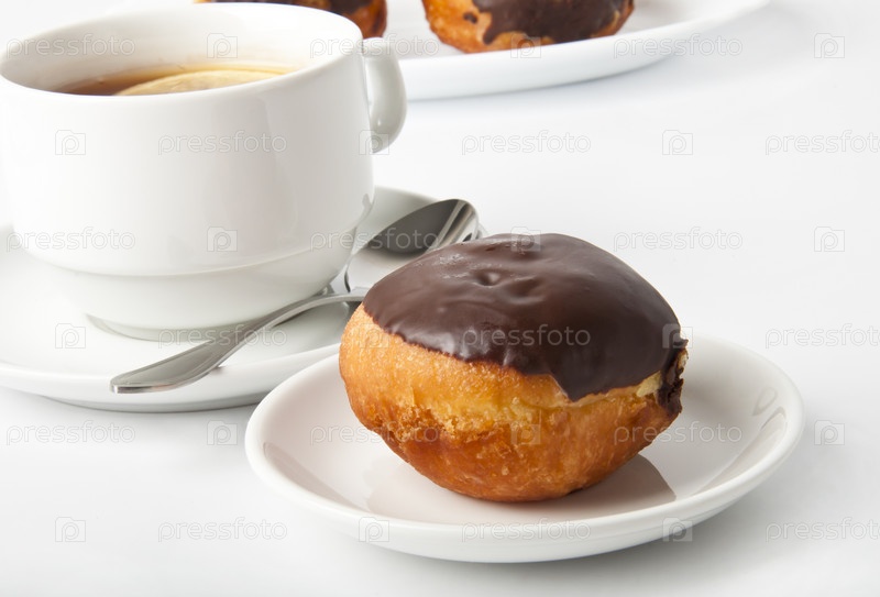 Пончик с шоколадом и чашка чая на белом фоне