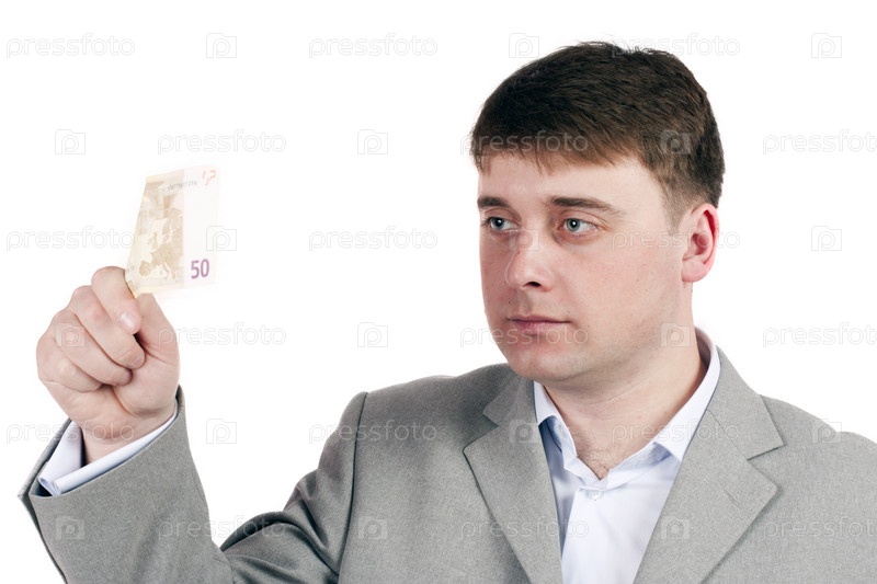 Бизнесмен рассматривает купюру на белом фоне