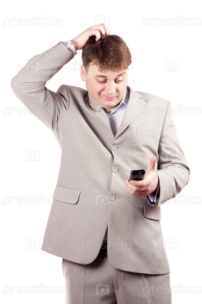 Бизнесмен рассматривает пульт на белом фоне