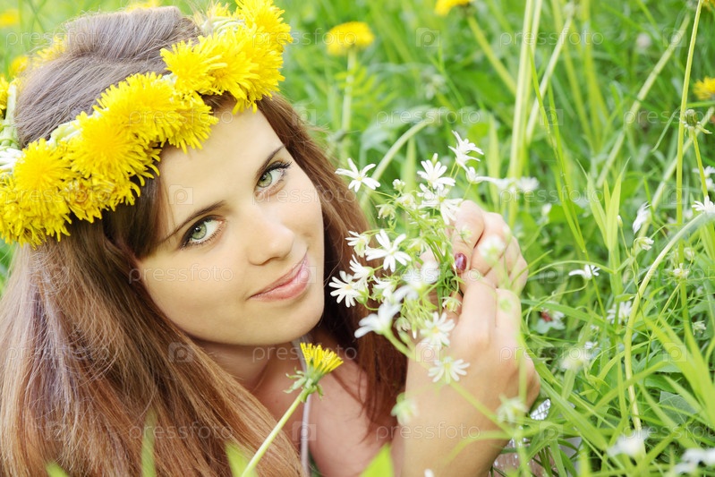 Девушка с венком на голове среди цветов