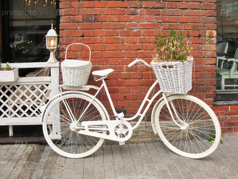 Фрагмент оформления летнего кафе с велосипедом, выкрашенным в белый цвет
