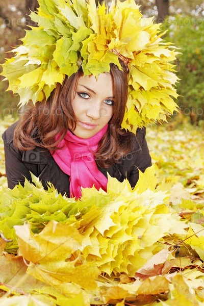 Красивая женщина в венке из желтых листьев