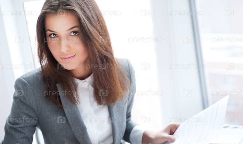Портрет молодой бизнес-леди в офисе с документами в руках