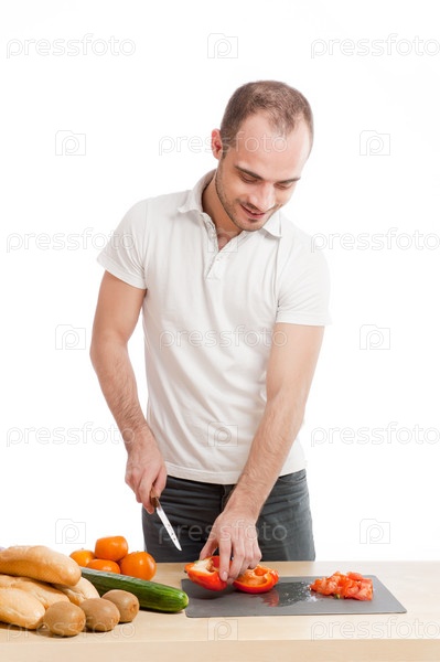 Мужчина готовит салат на белом фоне