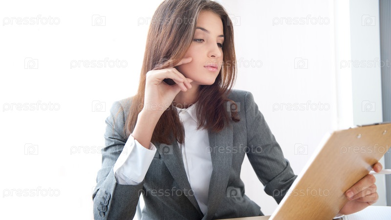 Портрет молодой бизнес-леди в офисе с документами в руках